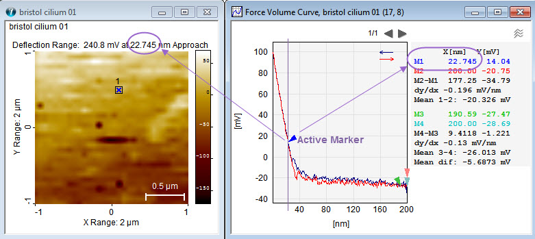 In this example three markers are synchronized to same lateral position for the topographic, the force volume and the deduced Young's modulus images. The graphs deduced from marker 1 is shown a the bottom.
