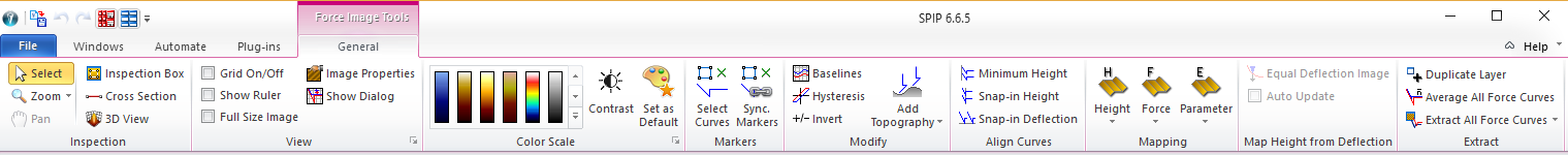 Most of the tools in the General tab are generic and identical with the tools found on the General tab of 2D Images, including Color Scale adjustments, zooming etc. Therefore, only tools dedicated to Force Volume are described here.