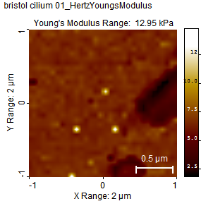 Calculation of the Young's modulus image: The left image shows the topographic image acquired simultaneously with the force volume image shown secondly. The third image is the calculated Young's modulus image where the Hertz model was used