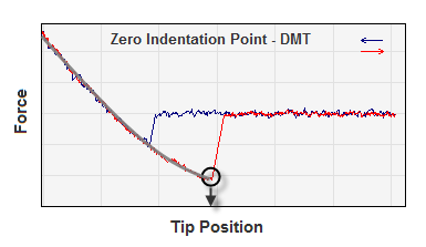 In SPIP™ the Point of Zero Indentation in the DMT models is the tip position where the retraction forces exerted by the cantilever balance the attractive forces between the tip and the surface. This point is found on the retract force curve where adhesion is maximum. Typically the tip will pull off when the retraction force is increased further. If the tip and surface comply with the model, the tip apex will just exactly touch the surface at this point, and mapping this point will give an image of the undisturbed surface not deformed / indented by the tip. Note that the method for identifying this point is an option in the Force Curve Analysis dialog.