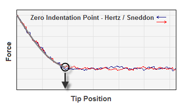 In SPIP™ the Point of Zero Indentation for these two models is the tip position where the tip touches the surface without actually indenting the surface; thus the applied force is zero. Mapping this point yields an image of the undisturbed surface not deformed (indented) by the tip. Note, that the method for identifying this point is an option in the Force Curve Analysis dialog.