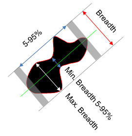 Minimum Breadth 5-95% is the minimum local breadth found along the Shape’s length axis. The first 5% and last 5% along the length of the Shape are ignored. The reason is that most Shapes will narrow in at either end resulting in a minimum local breadth close to zero at the end. In most cases this is not the value looked for. Therefore ends are ignored. This may in rare cases surprisingly result in a value smaller than the Average Breadth (short Shapes).